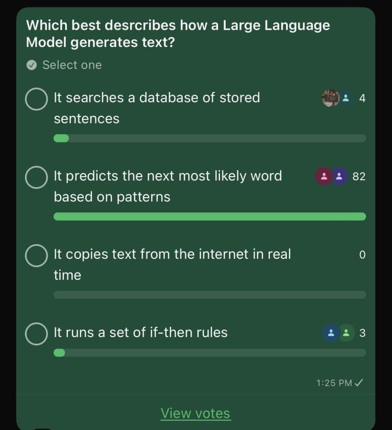 We asked our community a simple question: “Which best describes how a Large Language Model generates text?”